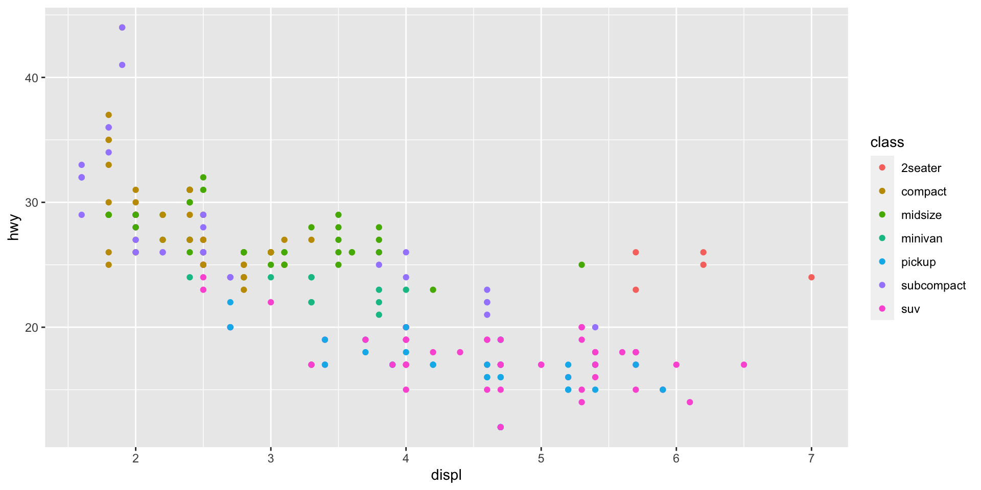 Compare displacement (displ) vs highway efficiency (hwy) and color the data by vehicle class (class). Store the ggplot object in a variable.