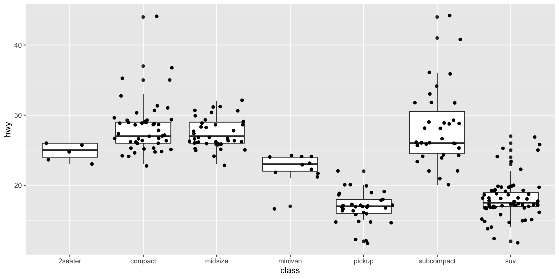 Look at the distribution of the highway millage (hwy) in each of the vehicle classes (class)